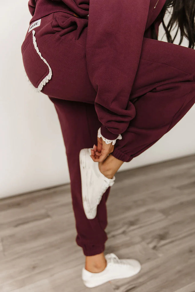 The joggers you know and love with a beautiful lace pocket detail and a maroon color you can't pass up. Pair with the matching HalfZip for the complete fit! Buy a matching set and get 10% off the bottoms! Sweater found here!