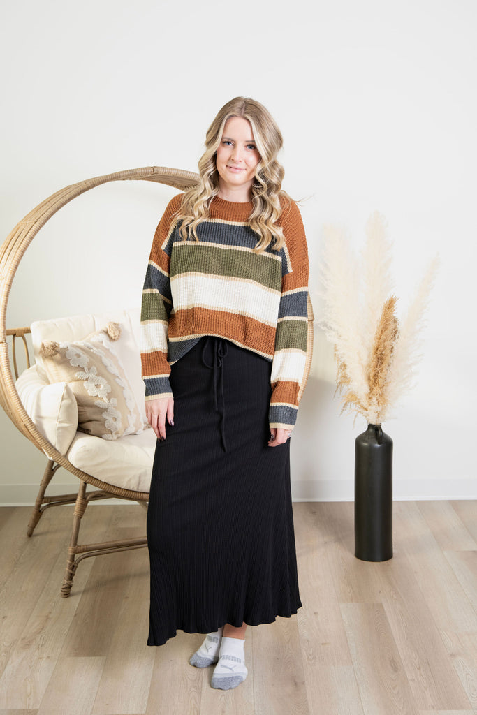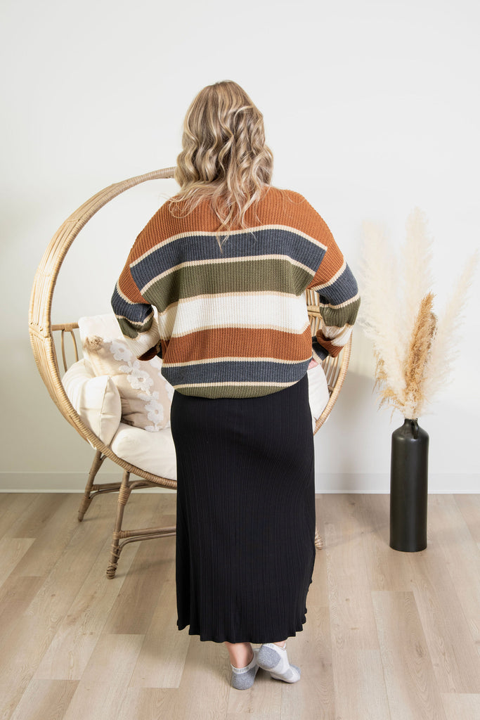 The Brynn Sweater brings cozy fall vibes with its soft fabric and oversized fit. Bold wide stripes in warm autumn tones add a playful splash of color, making it the perfect sweater to snuggle into on crisp days. Stylish, comfy, and fun—Brynn is your new go-to for seasonal layering.