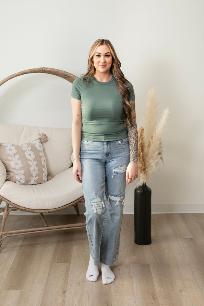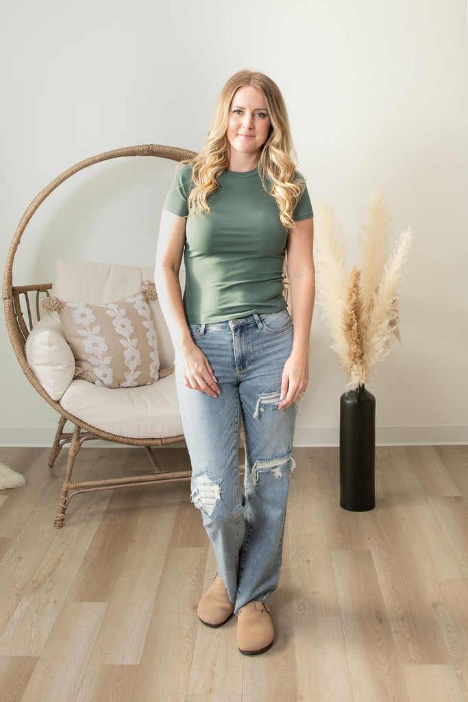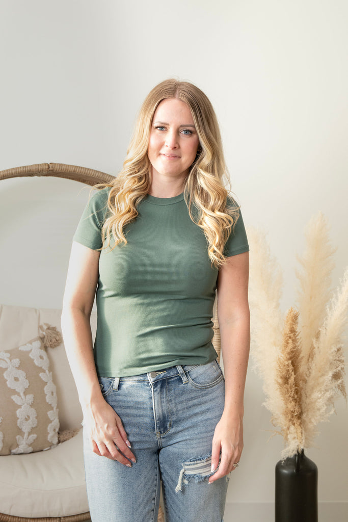 The ultimate wardrobe essential that actually lives up to the hype! Our Signature Fitted Tee hugs you in all the right ways with its super stretchy ribbed fabric that moves with your body. Whether you're running errands or getting cozy, this perfect basic delivers comfort without compromise. Available in a gorgeous range of colors—including this stunning Moss shade—so you can mix, match, and make it yours. Simple, versatile, and impossibly soft.