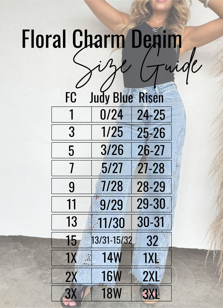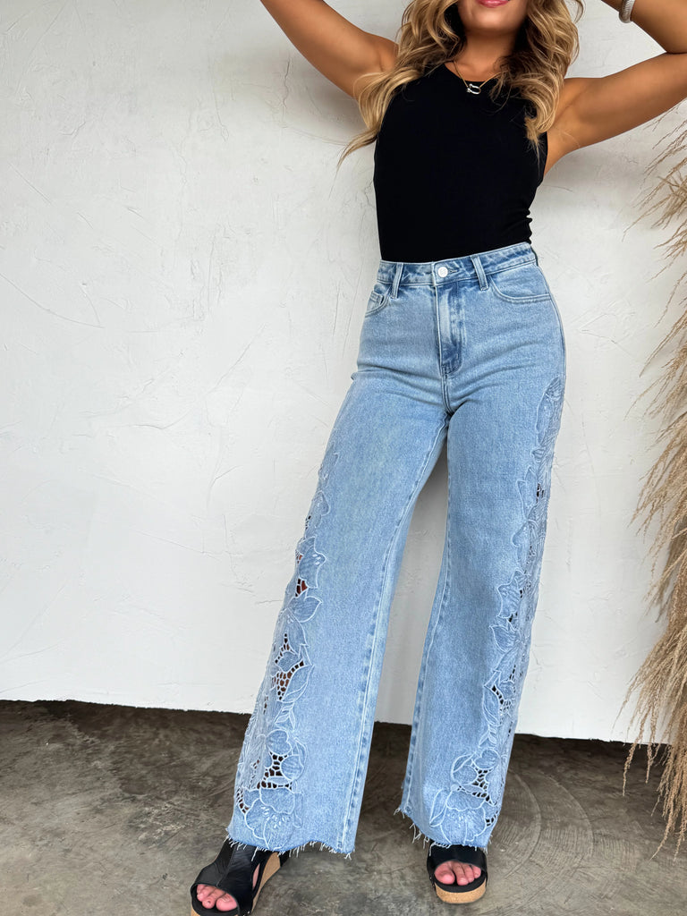 The jean you have been asking for is finally here!  Delicately embroidered flower and laser cut lace size panel makes our newest style jeans so unique and wildly popular! Semi high rise, wide leg and has stretch.