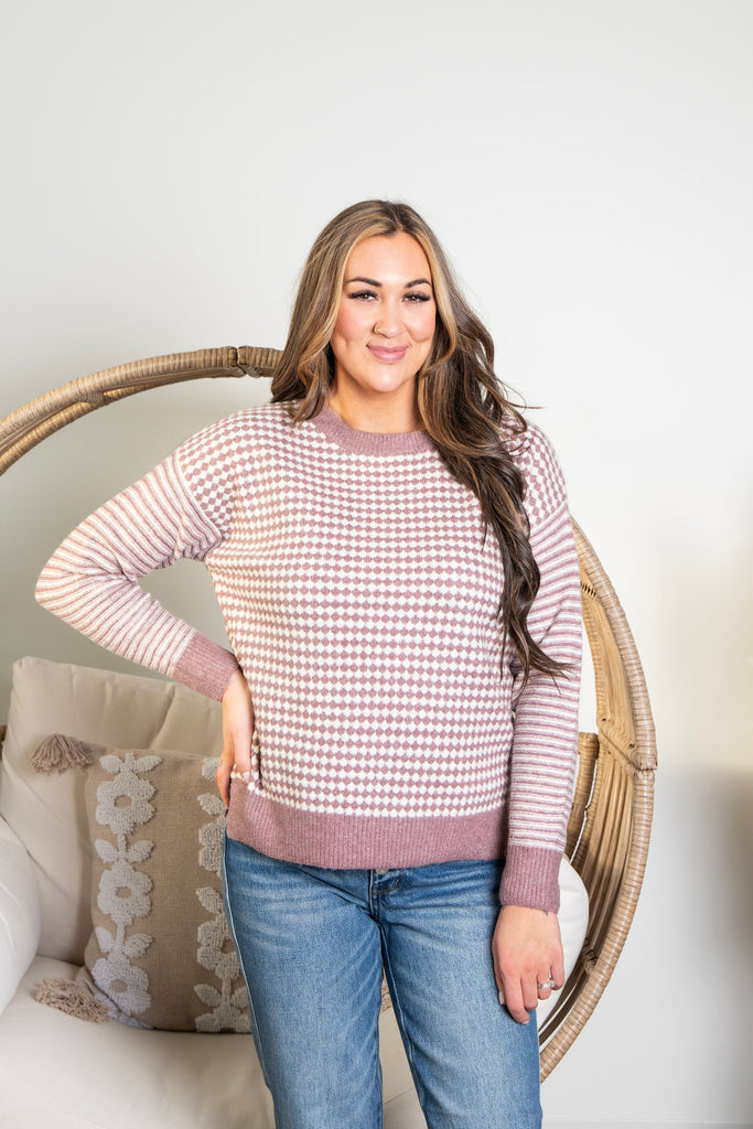 Snuggle up in this delightfully unique sweater that's as one-of-a-kind as you are. Adorned with an eye-catching pattern and draped in soothing dusty mauve, it's the ultimate cozy companion for lazy days and casual hangouts. This playful knit strikes the perfect balance between comfort and character, making it impossible to resist reaching for it again and again.
